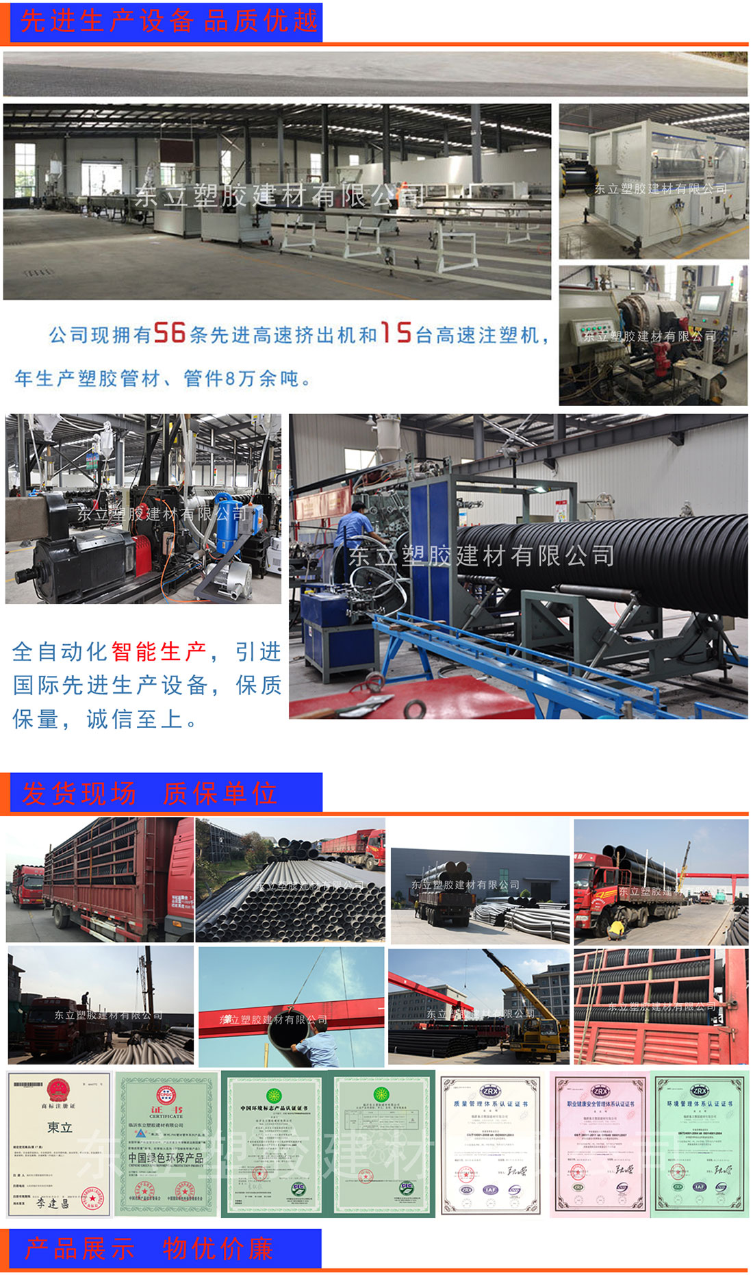??主要生產“東立”品牌塑膠管道,主要產品包括五大系列十六種產品,規格齊全,產能龐大、供貨及時,設備先進、質量穩定,服務優良、滿足客戶的需求。